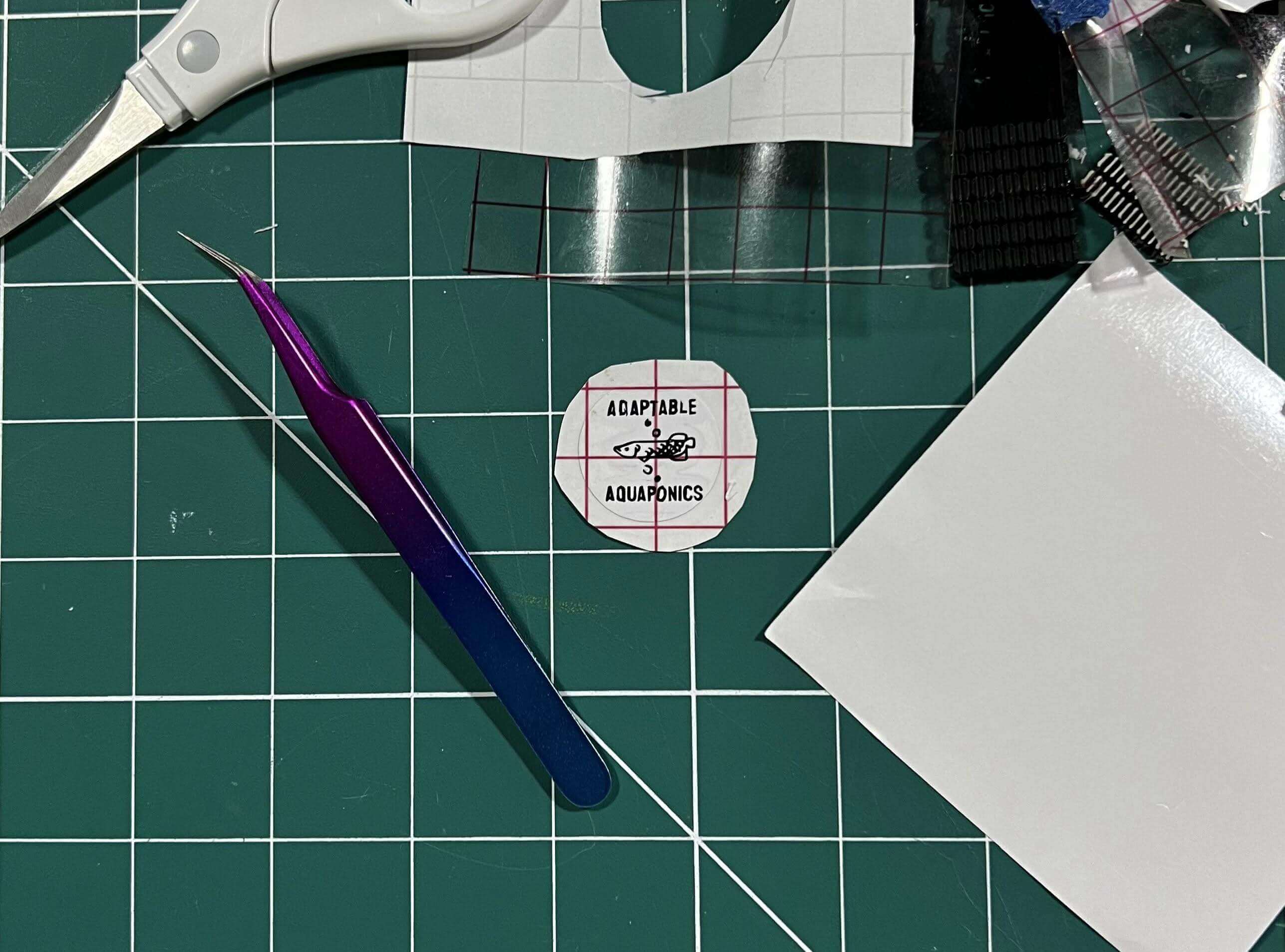 As a finishing touch, I used a Cricut Explore Air 2 to cut the sign attached to the side of Adaptable Aquaponics from vinyl. Though I’ve made dozens upon dozens of stickers with the same workflow, the scale of this logo proved to be a bit of a challenge. I not only had difficulties weeding the cut vinyl at such a small scale, but the machine itself was ripping up parts of the design upon retraction. I ended up altering the cut settings to a custom array as suggested by sofontsy.com, using the Washi Sheet default with a pressure set to More. With these settings, I was able to get a clean enough cut that I could weed the sticker, layer the two colors, and then apply to the side of the Adaptable Aquaponics model.