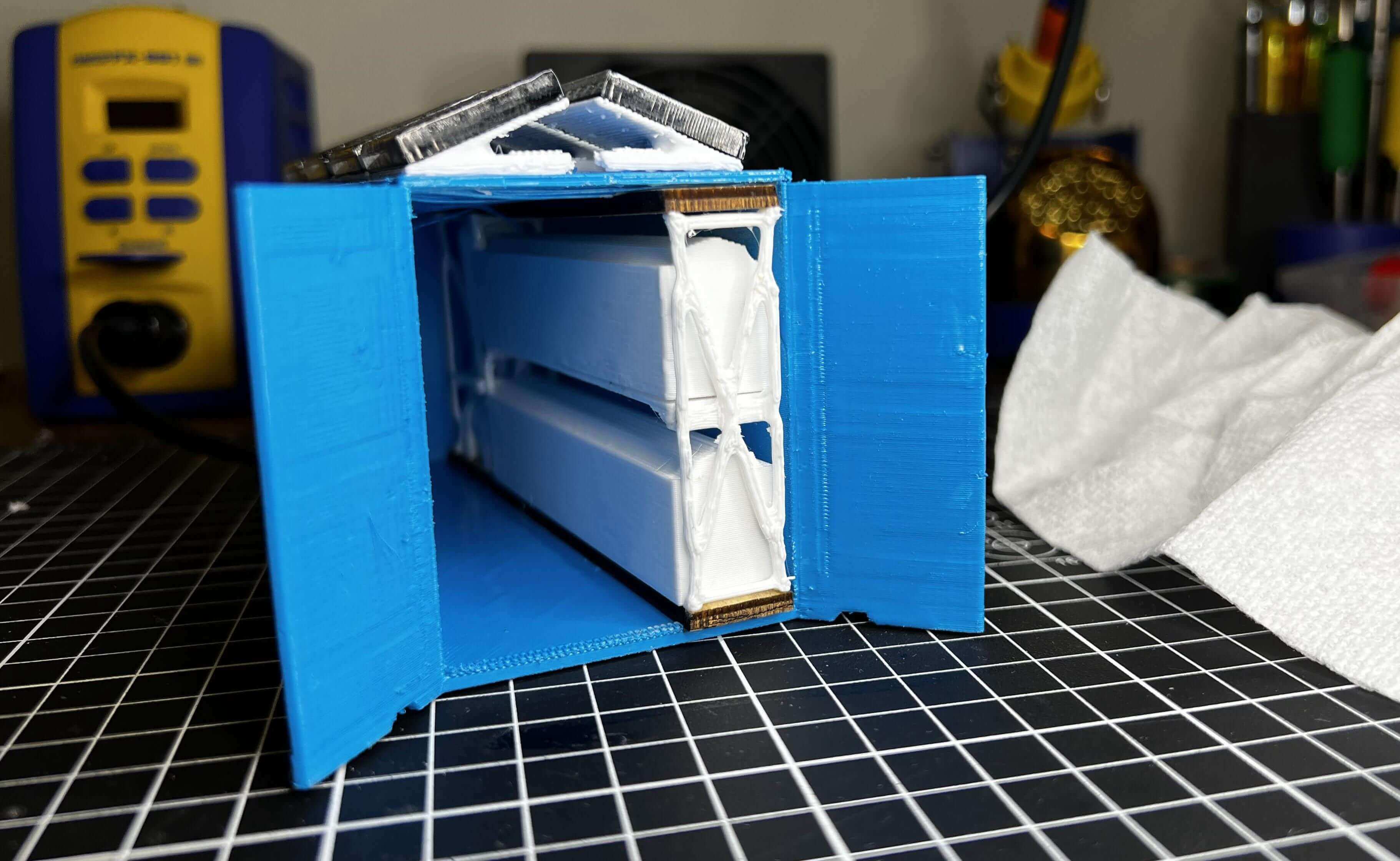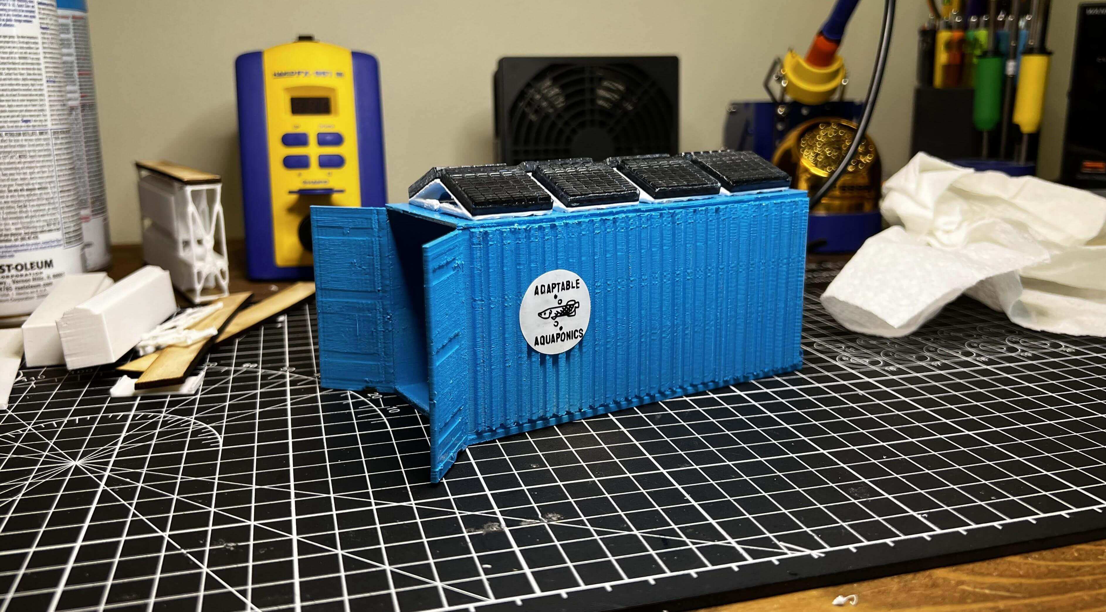I cleaned up the final cut parts with some soap and water, before continuing to attach each solar panel to its 3D printed mount & then to the roof of the Adaptable Aquaponics shipping container.