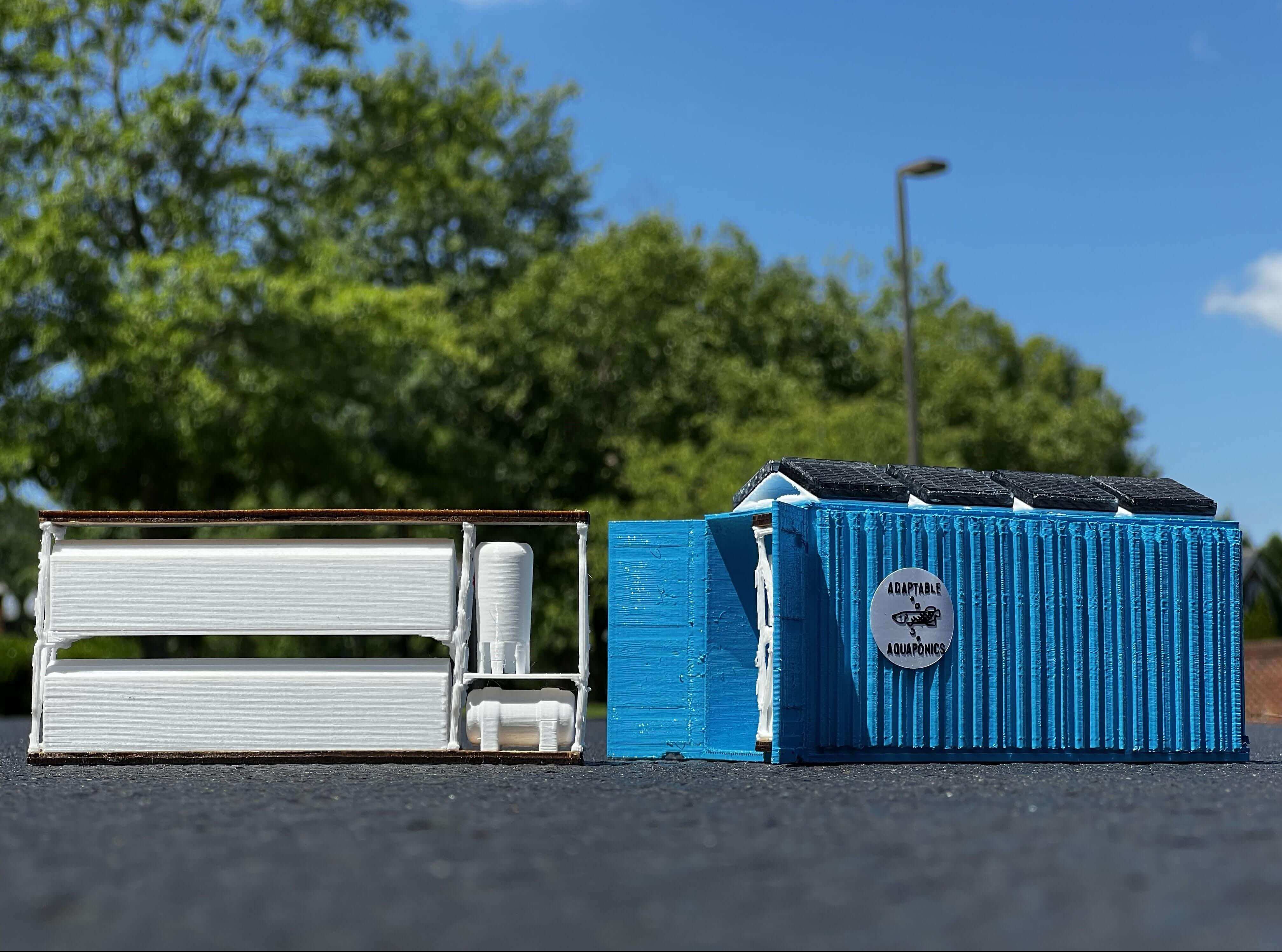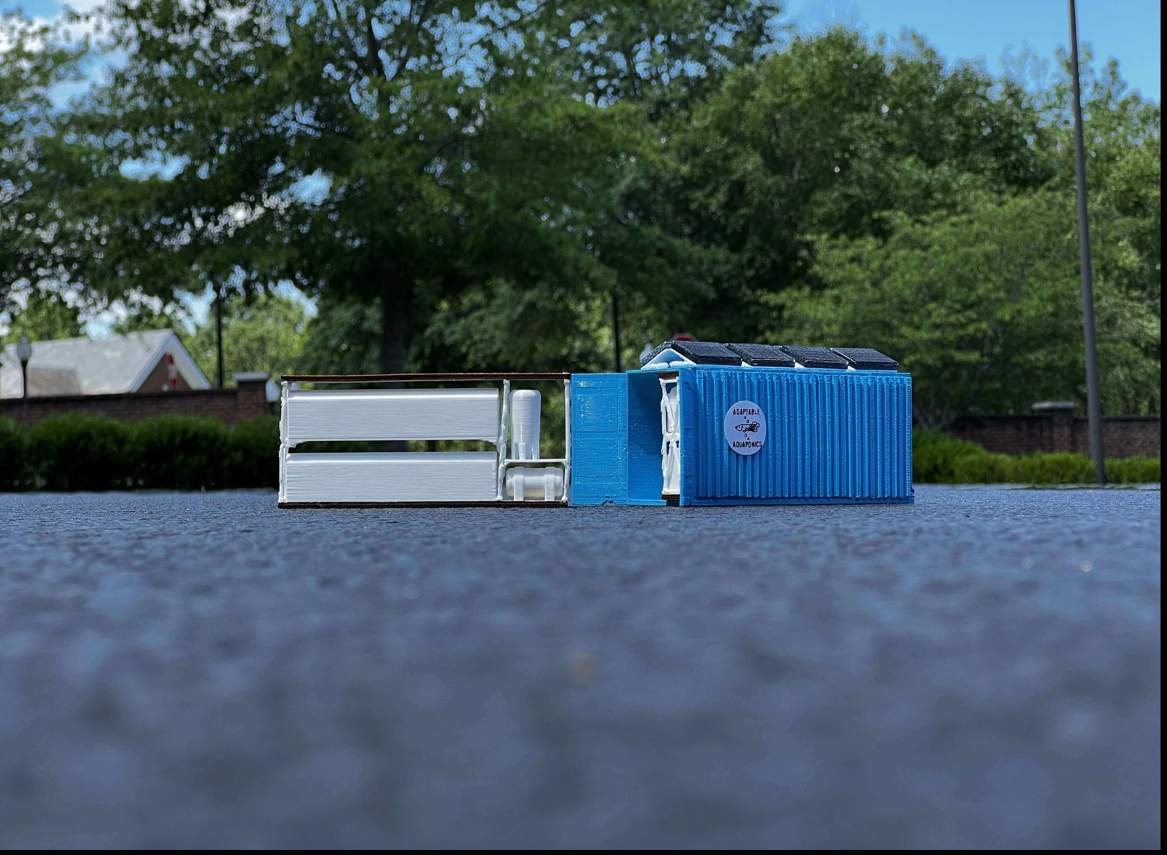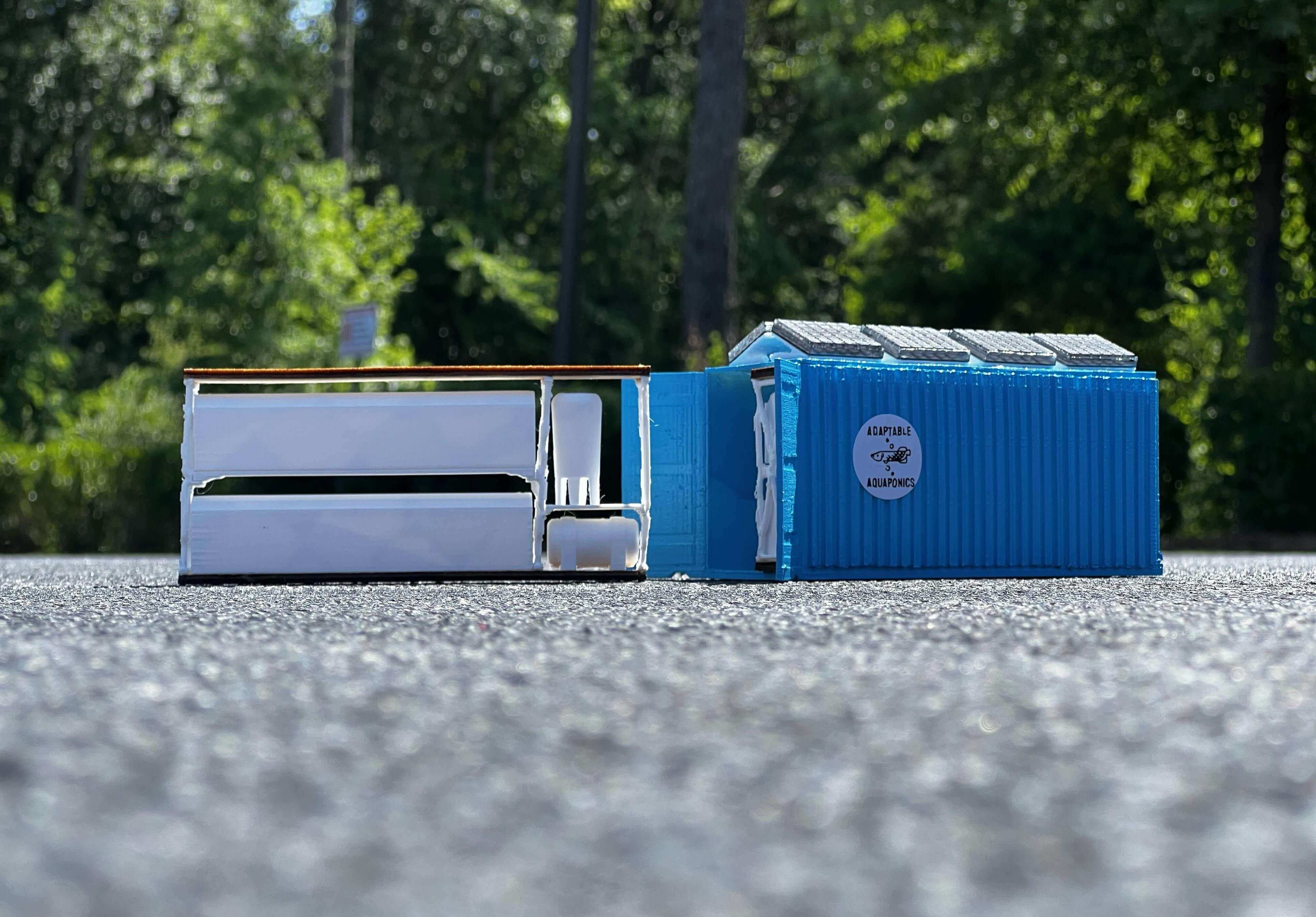 With the design and prototyping completed, I headed out to my local strip mall for a photo op, only getting a couple of strange looks from shoppers wondering what the boy in the old-navy pajama pants was doing taking pictures of a miniature in the middle of the parking lot. But it was worth it! As opposed to settling for a diorama background, or just pictures of my model on my workbench, I highlighted a legitimate potential environment for such a product, and I promise you, when Adaptable Aquaponics hits full scale in a parking lot, the shoppers won’t be blown away by my magnificent fashion choices, but instead by the wonders of Aquaponics!