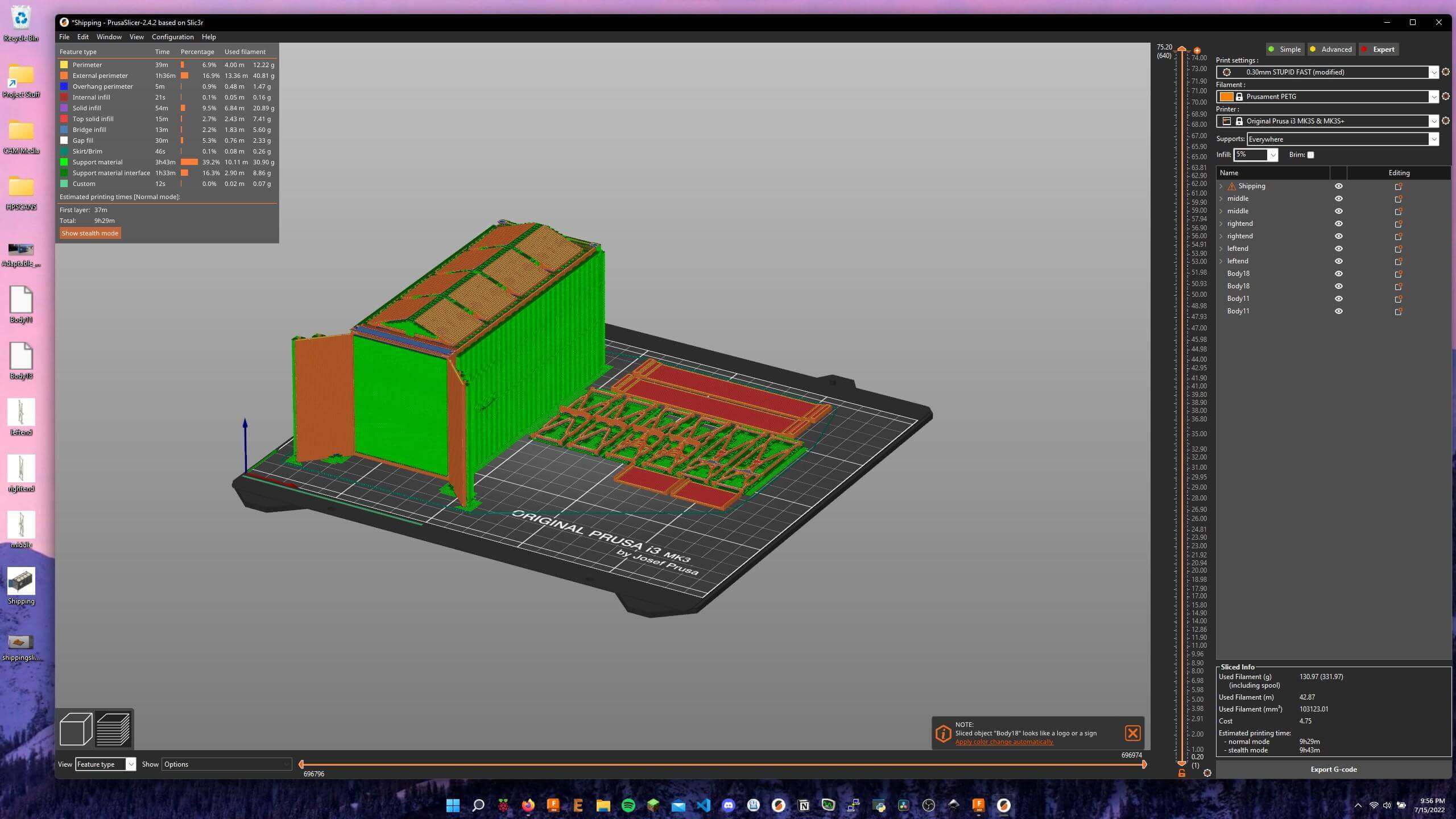 Computationally designed elements utilize organic surveys to ensure optimal geometry for both strength and efficiency, thus the perfect partner for additive manufacturing. I opted to 3D print all elements of my scale model that utilized Fusion 360’s Automated Modeling, including the shipping container with its solar panel mounts & Aquaponics Rack with its vertical supports. I also printed the contents of each aquaponics rack to achieve the highest accuracy to the draft angles and plumbing locations on the bodies. All parts for this project were printed on my Prusa I3 MK3S+ with a 0.4mm nozzle at a 0.3mm layer height. I chose a white PETG, along with a pretty aggressive layer height to allow for ease of post-processing & painting of the model.